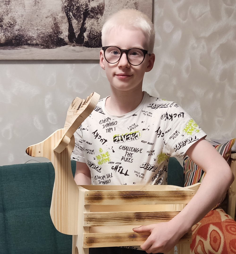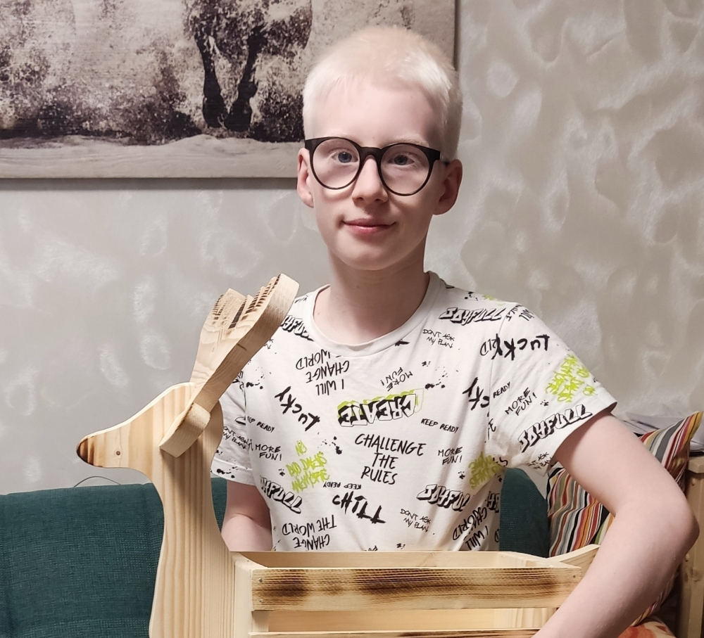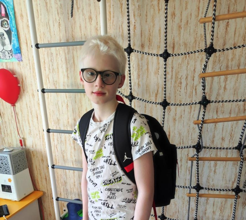 "У Глеба, - пишет Алена,- глазо-кожный альбинизм и низкое остаточное зрение 10%, Глебу 11 лет, он хорошо учится в школе и занимается скалолазанием уже почти год. У нас в городе недавно открылось направление скалолазания для слабовидящих детей и сыну очень нравится заниматься. Глеб уже пробовал участвовать в соревнованиях в нашем городе Череповце и один раз ездили с ним в город Вологду, где он показал достойный результат.