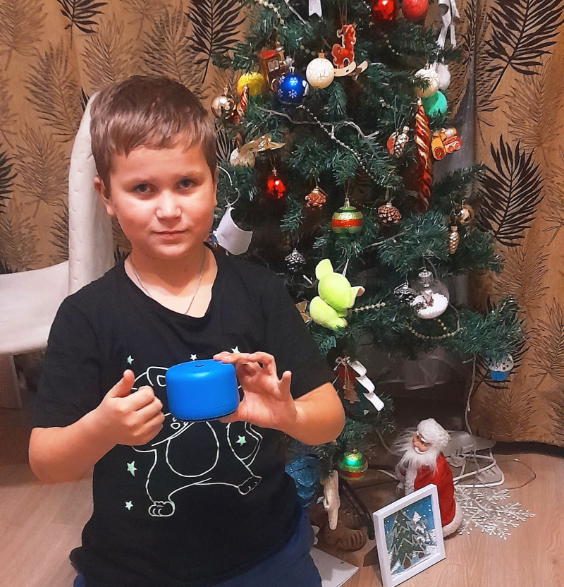 "Он очень способный ребёнок, - пишет Екатерина, - мы много занимаемся с логопедом и с вашей помощью посещаем Центр развития слуха и речи и, поэтому, учимся в массовой школе во 2 классе. Артём спортивный мальчик, любит кататься на велосипеде, самакате и играть в футбол. А на новый год мечтает получить умную калонку".