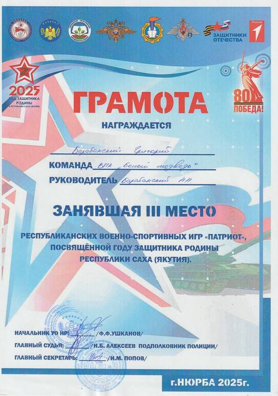 Состою в Военно-патриотическом клубе «Белый медведь», в котором являюсь действующим командиром. Вместе с курсантами участвовали в районной военно-спортивной игре «Снежный барс», где почти всегда занимали призовые места, в районной «Зарница 2.0», в которой заняли 4 место и в республиканской военно-спортивной игре «Патриот», где заняли 3 место из многих районов.